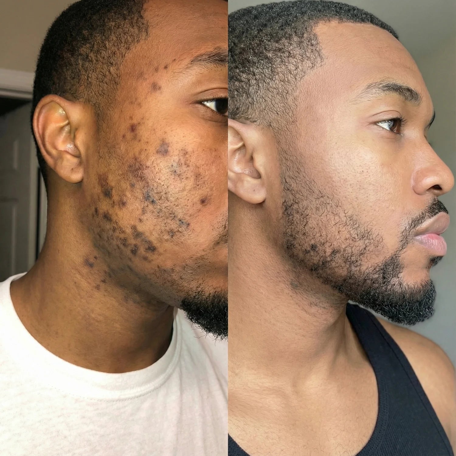 Ingrown hair formations rare or non-existent. Dark spots from old scars nearly invisible. Daily shaving becomes a confident, comfortable ritual.